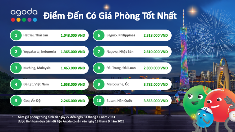 Với mục tiêu mang đến ưu đãi giá cạnh tranh nhất, Agoda đã phân tích giá phòng trung bình của các điểm du lịch trong khoảng thời gian từ ngày 22 đến 31 tháng 12. Theo đó, tại Việt Nam, Đà Lạt là địa điểm du lịch có giá cả phải chăng nhất, với giá phòng trung bình là 1.658.000 VND.