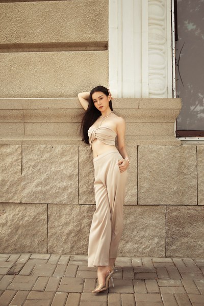 Áo quây khoe vai trần, eo thon phối cùng quần suông ton-sur-ton là trang phục dạo phố mùa hè của Cao Thuỳ Trang.