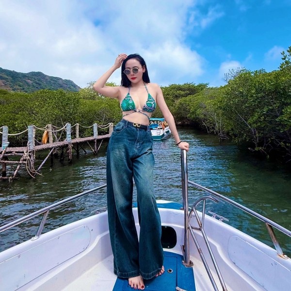 Nguyễn Huyền Trang biến hóa linh hoạt với phong cách thời trang biển mang tinh thần phóng khoáng nhưng vẫn giữ sự tiết chế cần thiết. Trên du thuyền, nữ diễn viên kết hợp bikini họa tiết với quần jeans ống rộng cạp cao, vừa tôn vòng eo gọn gàng vừa tạo cảm giác trẻ trung, cá tính.