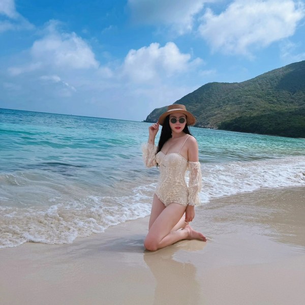 Trong khi đó, ở bãi biển, cô lựa chọn bodysuit ren gam trung tính với phom dáng ôm sát, kết hợp phụ kiện tối giản như mũ cói và kính râm, mang lại vẻ gợi cảm vừa phải, thanh lịch và trưởng thành.