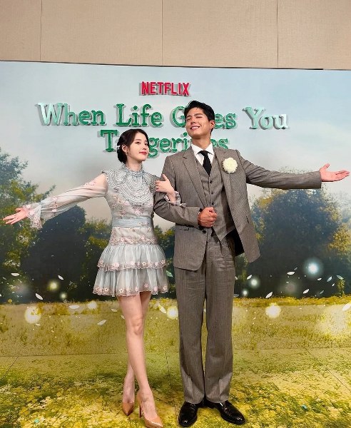 IU chia sẻ hậu trường chụp ảnh quảng bá phim Khi cuộc đời cho bạn quả quýt (When Life Gives You Tangerines) bên bạn diễn Park Bo Gum, hôm 19/3. Bộ phim đang thu hút sự quan tâm của khán giả, ghi điểm nhờ kịch bản chắc tay về cuộc đời những người lao động ở đảo Jeju. Tác phẩm ra mắt hôm 7/3, nhanh chóng vào top 10 phim truyền hình không nói tiếng Anh được xem nhiều nhất trên nền tảng Netflix toàn cầu suốt hai tuần.