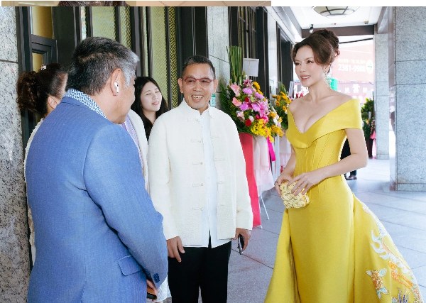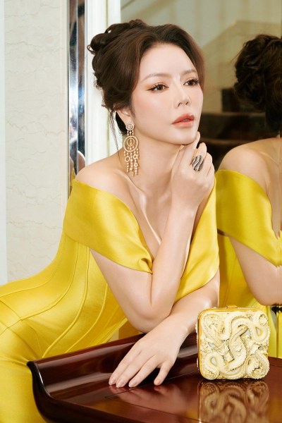 Cô vừa trở về sau chuyến công tác Đài Loan, gặp gỡ một số tỷ phú, doanh nhân nổi tiếng. Khi tham dự một sự kiện, Lý Nhã Kỳ (phải) diện váy dạ hội kết hợp phong cách cổ điển và hiện đại của nhà thiết kế Nguyễn Phúc Tuấn.