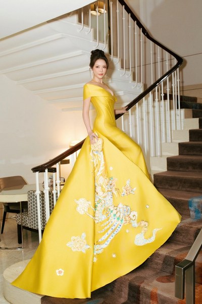 Nhà mốt sử dụng chất liệu tafta ánh kim cao cấp, sắc vàng để tạo vẻ sang trọng, quyền quý. Thiết kế mang phom dáng cúp ngực, sử dụng kỹ thuật rập để tạo hình đường cong ở hông, eo.