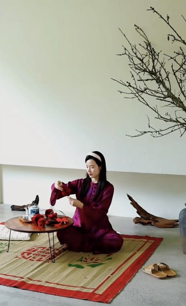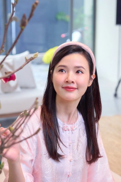 Lúc ở nhà, cô chọn áo bà ba cách điệu, gam màu tươi tắn như hồng, tím, chất liệu lụa, thêu nổi phần họa tiết hoặc đính hoa.