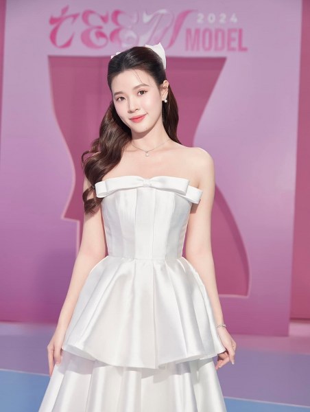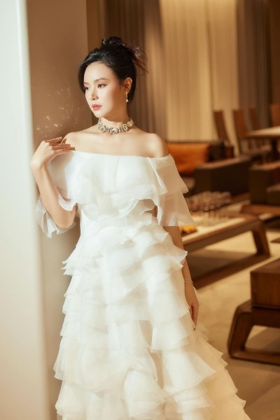 Cô ưu tiên những thiết kế dài quét đất dáng chữ A, giúp tôn chiều cao hiệu quả. Trong một sự kiện ở TPHCM tháng 11 năm ngoái, cô ghi điểm với đầm đính hàng trăm chiếc nơ của nhà thiết kế Hà Thanh Việt.