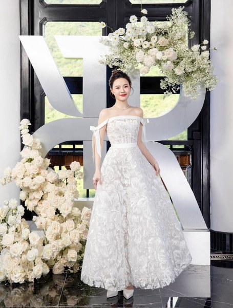 Tháng 8, tại sự kiện ở Đà Nẵng, cô chọn đầm ren xuyên thấu trễ vai của Chung Thanh Phong, phối giày platform cao 15 cm.