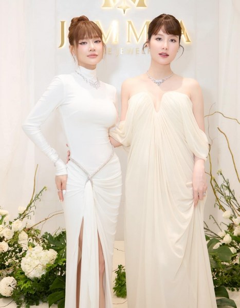 Tham dự một sự kiện tháng 10, Nhã Phương (trái) chọn đầm xẻ đùi, xếp nếp của Lê Thanh Hòa. Cô ghi điểm khi chọn kiểu tóc búi cao, phù hợp với thiết kế cao cổ.
