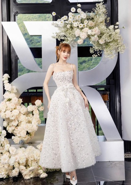 Loạt váy trắng của Nhã Phương có kiểu dáng và chất liệu đa dạng. Cô tham dự một chương trình hồi tháng 10 với váy ngắn ôm dáng kiểu corset, nhấn bằng đuôi váy dài phía trước.