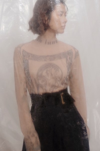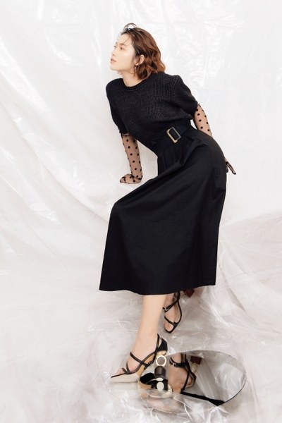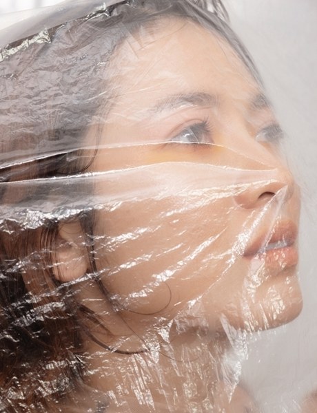 Trong bộ ảnh về chủ đề bảo vệ môi trường, diễn viên Oanh Kiều nằm giữa đống túi nylon, cầm đồ nhựa, dán miếng giấy nylon trên miệng...