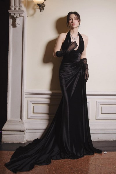 Thiết kế khoét sâu được tô điểm bằng bộ trang sức ánh kim, tôn vóc dáng 1,68 m của diễn viên.