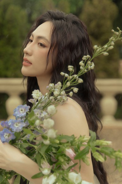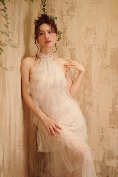 Cô theo đuổi hình tượng mong manh khi tạo dáng với bộ đầm dây.