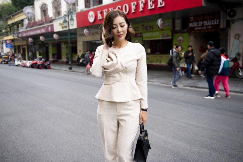Chi tiết hoa hồng trước ngực là điểm nhấn thu hút cho trang phục. Kết hợp thêm túi xách, diện set đồ màu kem và xuống phố cực thời thượng thôi chị em