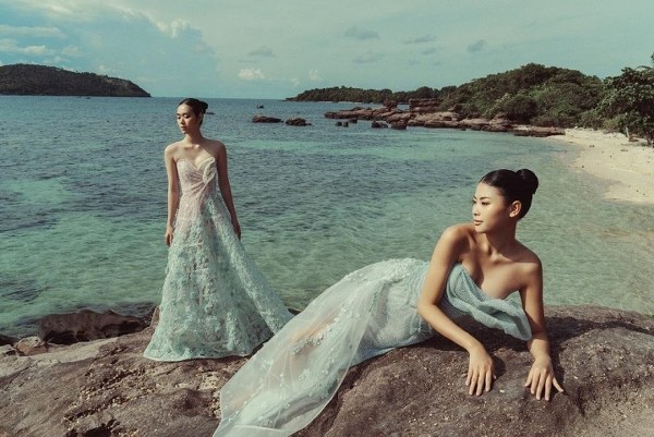 Nữ diễn viên Diệp Bảo Ngọc cùng người mẫu Đào Thị Hà xuất hiện kiêu sa trong bộ váy cưới của NTK Hoàng Hải.