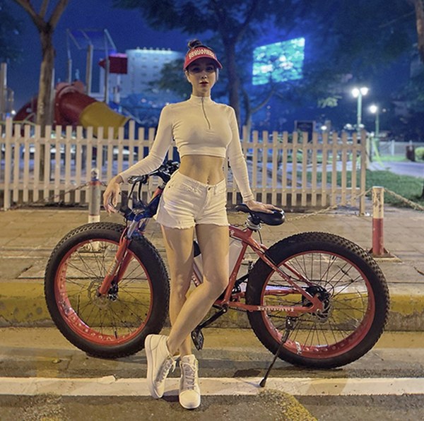 Trang phục bó sát, khoe ba vòng sắc nét được Diệp Lâm Anh sử dụng khi đạp xe để tăng cường sức khoẻ trong mùa dịch.