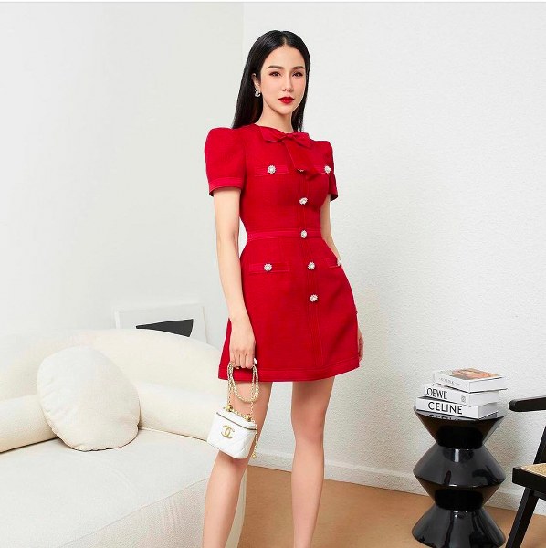 Phong cách trẻ trung của Diệp Lâm Anh với váy tôn đường cong và phụ kiện hợp xu hướng.