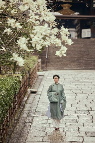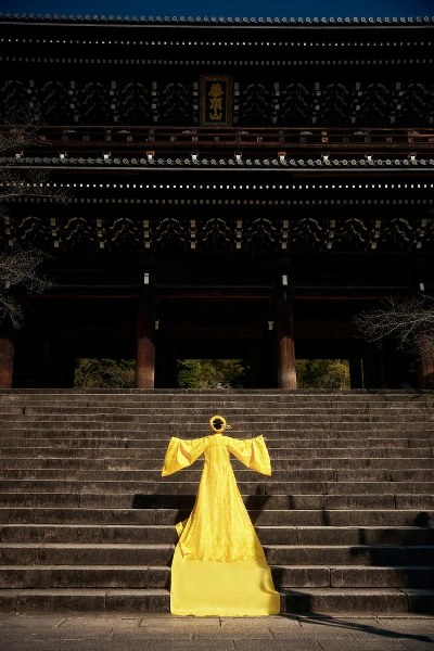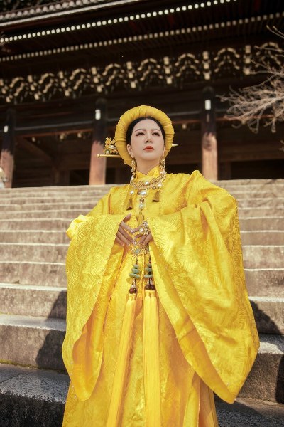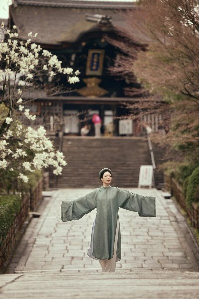 Khi đến ngôi chùa cổ Chion-in (Kyoto), Đinh Hiền Anh khoác lên bộ cổ phục vàng rực rỡ với phần tà dài quét đất, ống tay loe rộng.