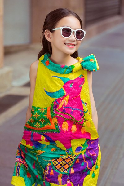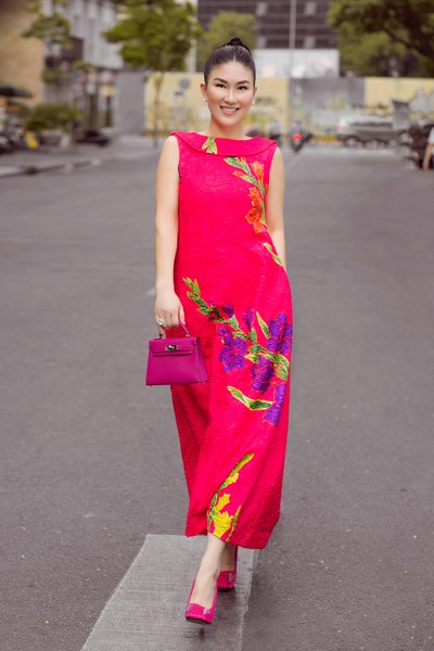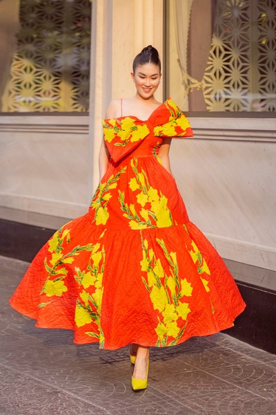 Đầm đi tiệc mang hơi hướng phong cách cổ điển với chi tiết váy xòe điệu đà. Ngoài hoa văn in mẫu lay ơn vàng, nhà thiết kế còn sử dụng nơ bướm to bản để tạo điểm nhấn cho trang phục.