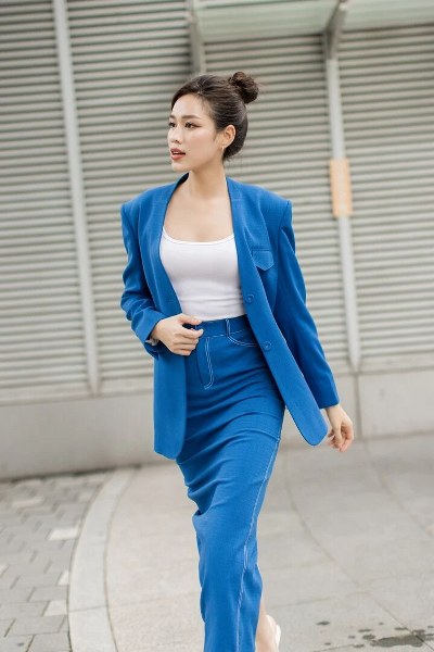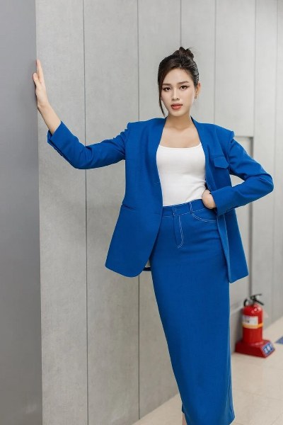 Đỗ Thị Hà cũng không ngại thể hiện vẻ đẹp quyền lực, chuyên nghiệp với áo vest xanh kết hợp chân váy bút chì cùng tông màu.