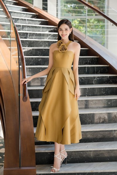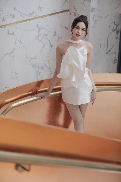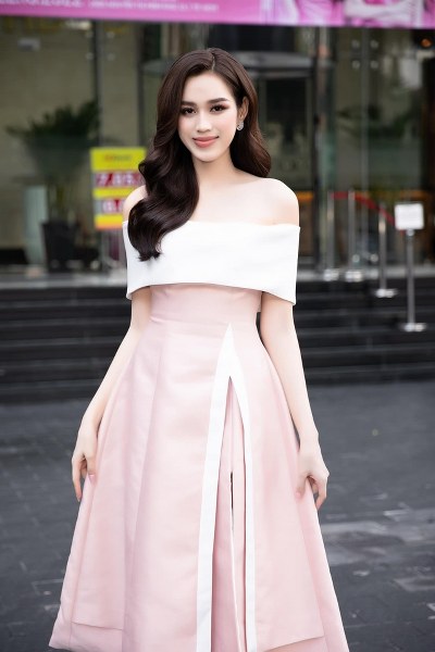Nàng hậu khéo chọn váy khoe vai thon và làn da trắng không tì vết. Khi mặc đầm có nhiều chi tiết trang trí, người đẹp tối giản các phụ kiện, trang sức và trang điểm tự nhiên để tạo tổng thể cân bằng hài hòa.