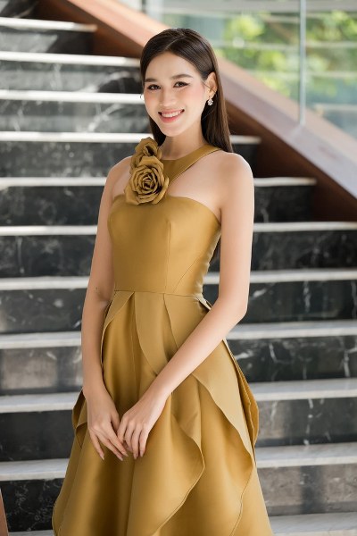 Váy đầm cổ yếm với phần đuôi cá được cắt may tinh tế giúp Đỗ Thị Hà tôn dáng vóc "thắt đáy lưng ong". Thiết kế có phần thân trên được chăm chút tỉ mỉ bằng cách xử lý bề mặt vải, qua đó tạo điểm nhấn thu hút cho outfit của nàng hậu 21 tuổi.