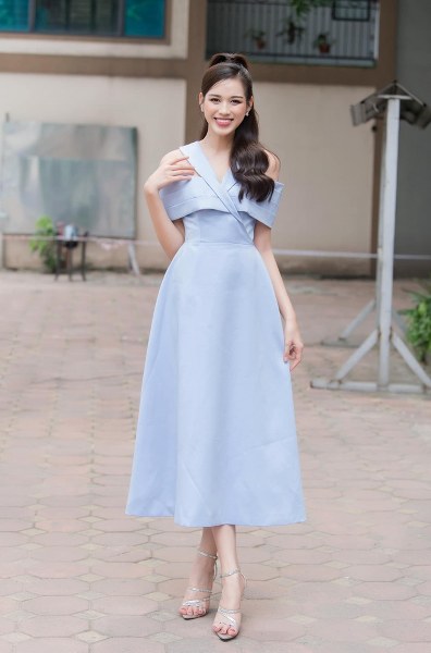 Với gam màu xanh dương nhạt, Đỗ Thị Hà chọn đi giày cao gót dây mảnh. Cách làm tóc được cô thay đổi luân phiên để tránh sự nhàm chán do lặp lại.