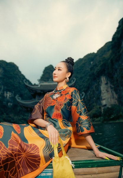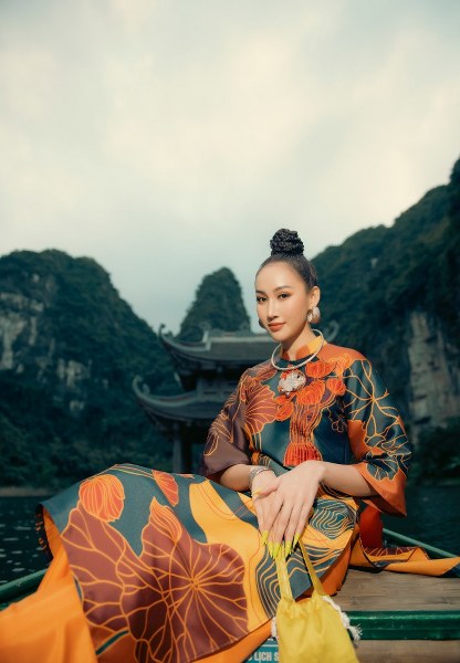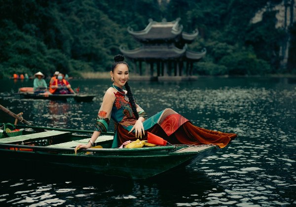 Quần thể Tràng An được xem là kiệt tác của thiên nhiên, từng được UNESCO công nhận là Di sản Thế giới. Người đẹp đã vượt một chặng đường khá xa để tận hưởng và thả mình vào vẻ đẹp của nơi đây. Cô tạo dáng trên những chiếc thuyền trôi giữa làn nước.