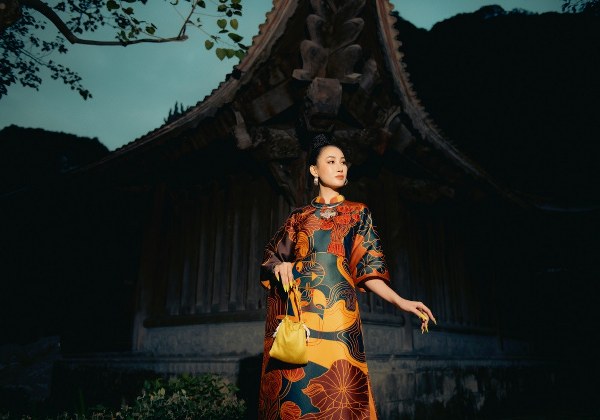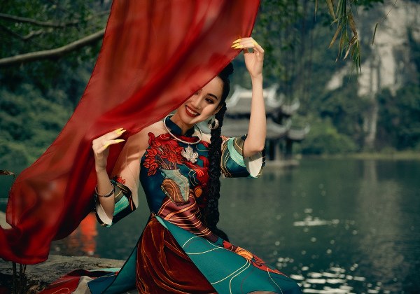 Những bộ áo dài cách điệu cô mặc lấy ý tưởng từ tranh đông hồ, hình ảnh con mèo, tương ứng với năm Quý Mão do nhà thiết kế La Sen Vũ sáng tạo.
