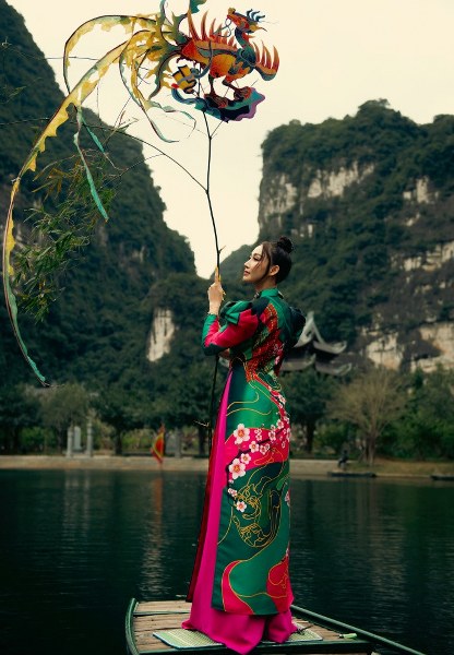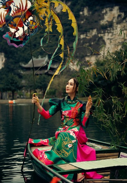 Đoàn Hồng Trang vừa có chuyến thăm quan và chụp ảnh tại Tràng An (Ninh Bình). Cô tái hiện văn hóa cây nêu ngày Tết trong những bộ áo dài cũng như quảng bá nét đẹp thơ mộng của địa danh.