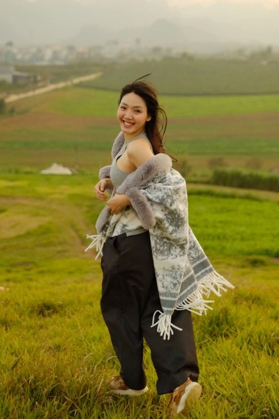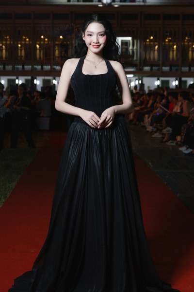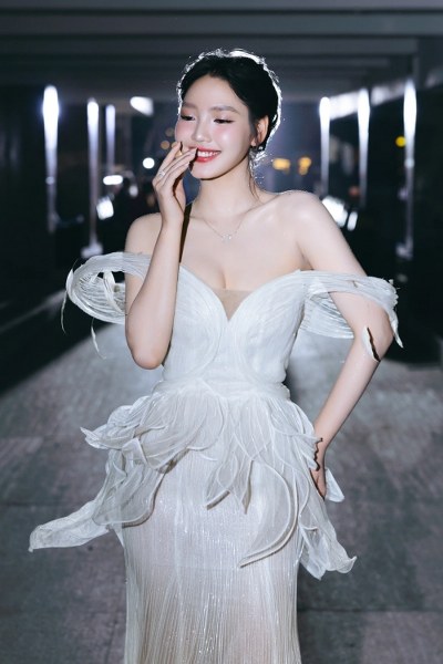Người đẹp diện đầm đơn sắc trên thảm đỏ Liên hoan phim Việt Nam, cuối tháng 11/2025 tại TP HCM. Cô đang theo học Phân hiệu Văn hóa, Nhạc viện TP HCM. Những ngày quay xa, diễn viên chuyển sang học online, tranh thủ thời gian rảnh trên phim trường để theo kịp bài vở.