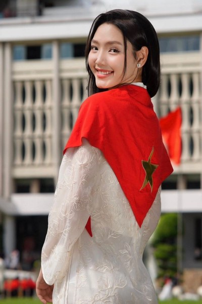 Diễn viên chụp ảnh mừng dịp 80 năm Quốc khánh ở Dinh Độc Lập, tháng 9/2025. Cô cho biết thời gian tới tham gia các khóa diễn xuất, học hỏi thêm kỹ năng để phát triển lâu dài trong nghề.