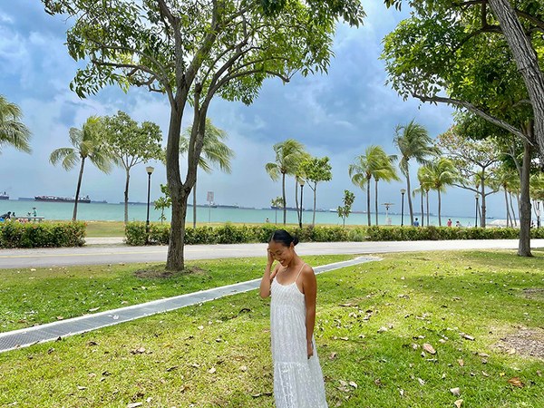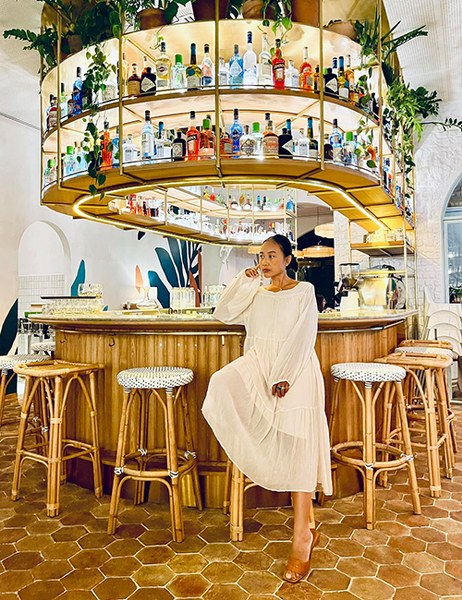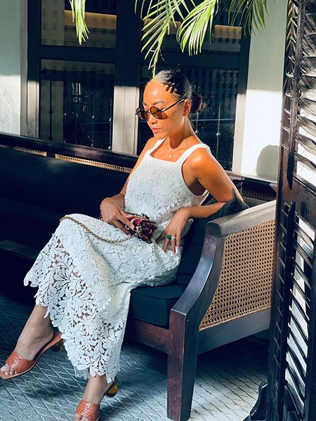 Bên cạnh các mẫu trang phục vải lụa nâng niu làn da, Đoan Trang cũng ưa chuộng chất liệu ren trắng ở dòng váy hai dây, đầm sát nách phù hợp với không khí biển đảo.