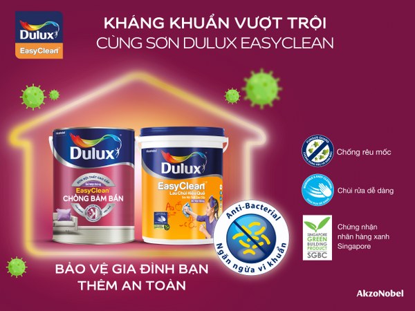 Chuyên gia từ Dulux cho biết dòng sơn nội thất Dulux EasyClean của hãng này có tính năng kháng khuẩn vượt trội được kiểm nghiệm bởi TUV SUD PSB Singapore, giúp ức chế sự phát triển của 6 loại vi khuẩn có hại phổ biến gây bệnh như bệnh về đường tiêu hóa, tiêu chảy, nhiễm khuẩn huyết, nhiễm khuẩn đường hô hấp, viêm màng não,.. Thêm vào đó là công nghệ chống bám bẩn chủ động, đặc biệt chống lại các vết bẩn dạng lỏng, ngăn chặn vết bẩn thẩm thấu vào bề mặt tường gây ố màng sơn, giúp việc lau chùi trở nên dễ dàng hơn và giữ gìn nhà cửa luôn sạch đẹp như mới.