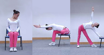 Tay phải đặt lên ghế. Tay trái giơ lên cao thẳng đứng, ngón tay duỗi thẳng, mặt quay về phía trái, mắt nhìn theo hướng tay. Sau đó, từ từ vặn người, hạ tay trái xuống, sao cho tay song song với mặt đất. Thực hiện động tác từ 5 – 10 lần. Tiếp theo đổi bên và tiếp tục thực hiện động tác. Động tác này tác động đến vùng eo, làm giảm lượng mỡ thừa, thu gọn vòng eo, thư giãn cơ thể.