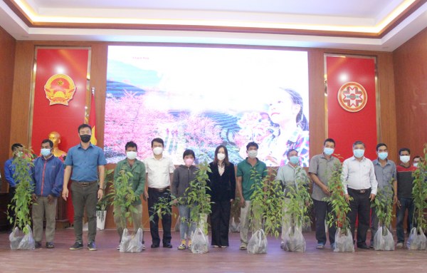Đại diện dự án Mây Hồng trao cây cho người dân tại huyện Khánh Sơn