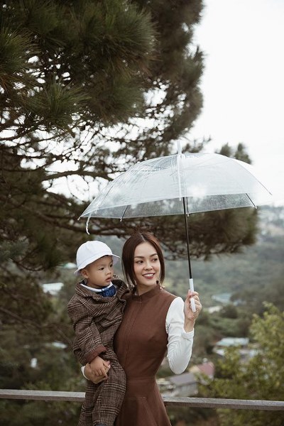 Không váy áo lộng lẫy, nữ diễn viên và con trai lựa chọn những bộ trang phục ton sur ton phù hợp với thời tiết cũng như phong cảnh ở Đà Lạt.