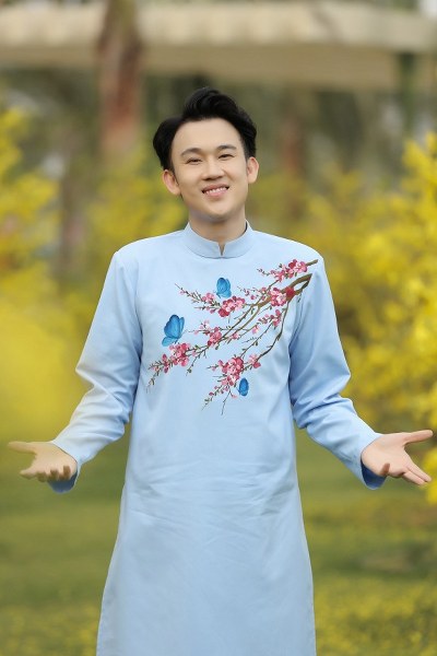 Diện áo dài với màu sắc tươi sáng được điểm xuyết cành đào ngày Xuân, nam ca sĩ vui vẻ tạo dáng giữa vườn hoa ngập tràn sắc màu. Giữa những nhành mai, đào và các khóm hoa sặc sỡ, Dương Triệu Vũ khoe nét điển trai cũng như sự trẻ trung "không tuổi" vốn đã là thương hiệu bấy lâu.