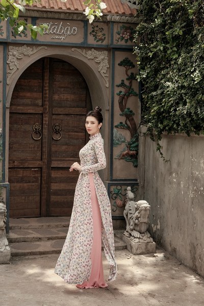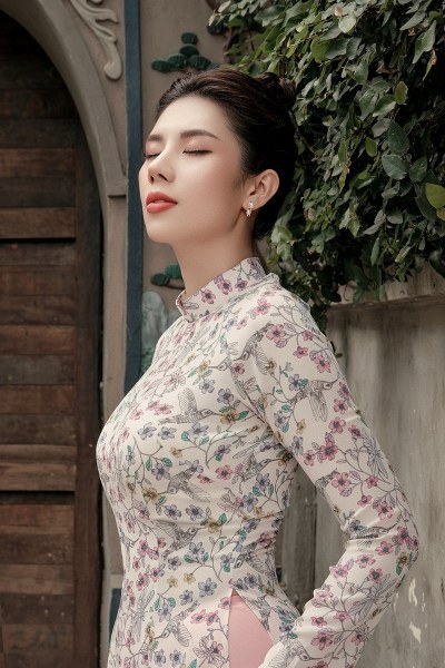 Áo dài hoa nhí tông màu pastel mang đến cảm giác tươi mát, sảng khoái khi 9X dạo bước dưới ánh nắng mùa hè. Người đẹp cho thấy cách mix match sáng tạo khi chọn phụ kiện tối giản, layout trang điểm tự nhiên để tạo nên sự cân bằng cho hình ảnh bản thân