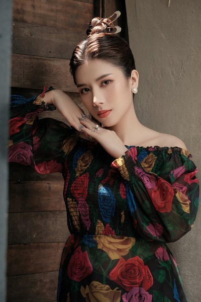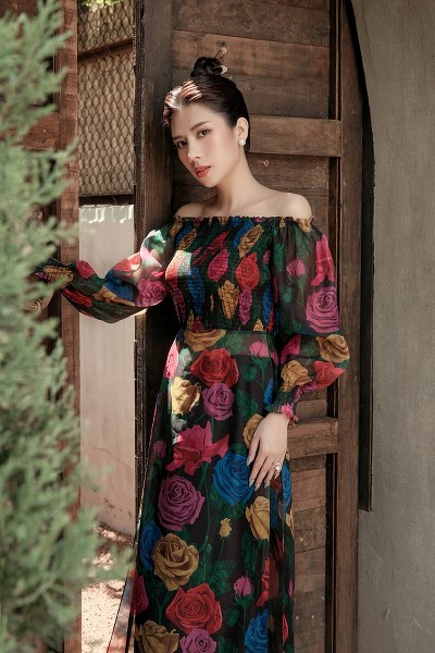 Áo dài cách tân họa tiết hoa hồng tạo nên sự tương phản giúp 9X khoe làn da mượt mà như "phát sáng".