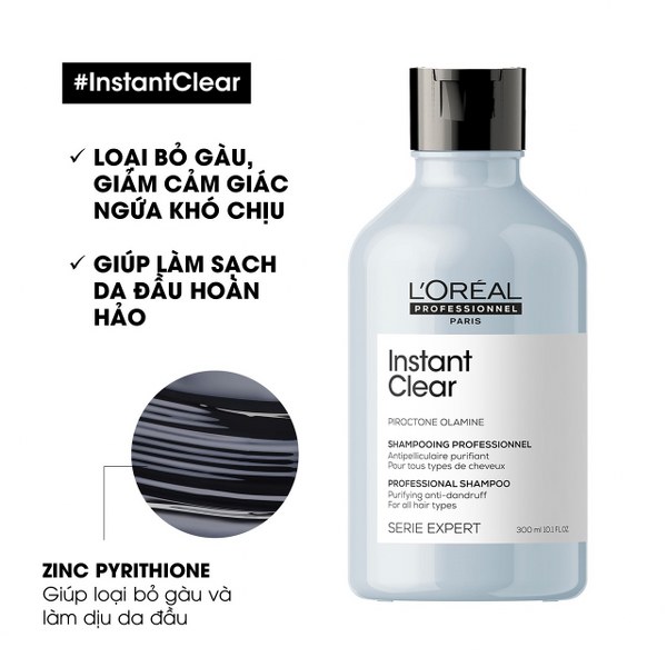 Nhằm làm sạch và bảo vệ da dầu trước những tác nhân gây gàu, L’Oréal Professionnel mang đến Instant Clear là sản phẩm dầu gội chuyên nghiệp nhằm xóa tan nỗi lo về gàu trên mái tóc. Hiểu rằng gốc rễ của gàu nằm ở da đầu, Instant Clear có hoạt chất Zinc Pyrithione nổi tiếng về khả năng giảm gàu hiệu quả, cùng với Citric Acid có tác dụng kháng khuẩn và làm sạch da đầu. Cơ chế hoạt động của Instant Clear là các hoạt chất sẽ tác động sâu trực tiếp thay vì chỉ tạo ra một lớp màng bọc trên da đầu giúp ngăn gàu rơi rụng, vì thế ngay từ lần gội đầu tiên, da đầu đã thuyên giảm các mảng bong tróc và có cảm giác sảng khoái không còn ngứa ngáy.