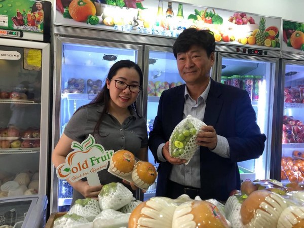 Chị Thanh Bình cùng Giám đốc Kfarm trong lễ hội Nho sữa Hàn Quốc tổ chức tại Goldfruit