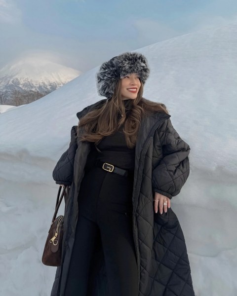 Ca sĩ kết hợp áo phao dáng dài cùng quần legging khi tạo dáng giữa trời tuyết.