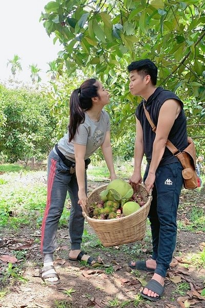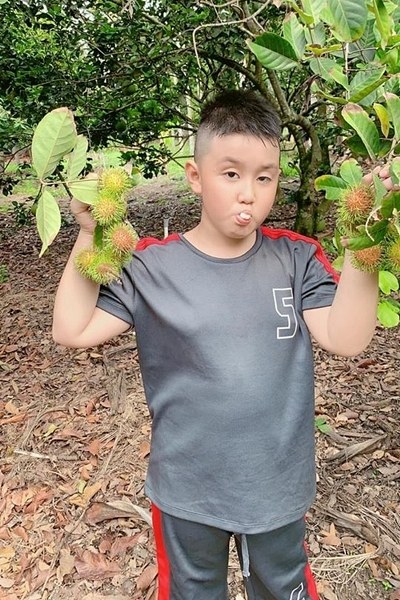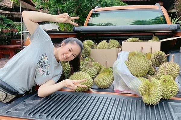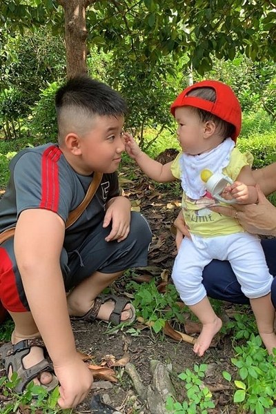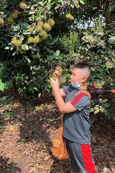 Vợ chồng Lê Phương đưa hai con Cà Pháo, Bông đến vườn trái cây của người thân để hái sầu riêng, măng cụt...