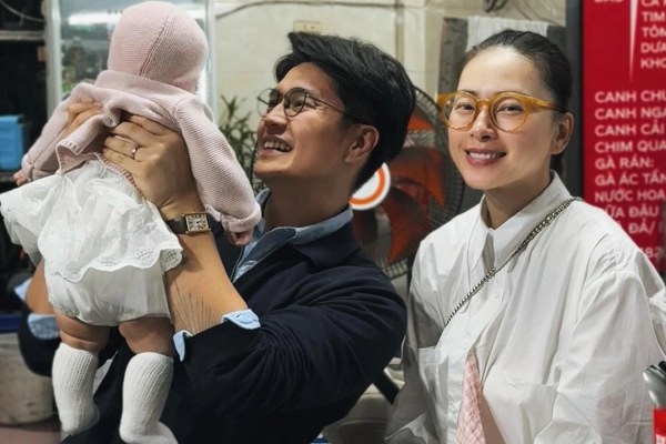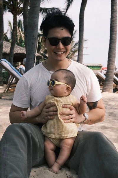 Doanh nhân Huy Trần cùng con gái sáu tháng tuổi chơi đùa trên cát trong chuyến đi Mũi Né, Phan Thiết vừa qua. Cặp sau lần đầu công khai hình con đầu lòng, trước đó họ chỉ chụp từ phía sau, hạn chế ảnh rõ mặt.