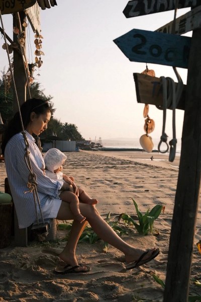 Ngô Thanh Vân cùng con tắm nắng trong không gian khu nghỉ dưỡng. Đạo diễn cho biết vợ chồng cô trân trọng từng giây phút bên con. "Đôi khi tôi chỉ muốn thời gian ngừng lại để bé cứ mãi đáng yêu như thế trong vòng tay ba mẹ", cô nói.