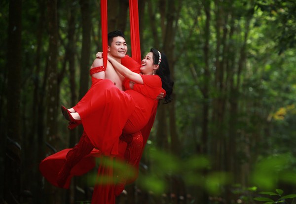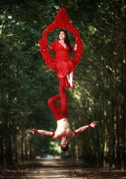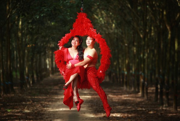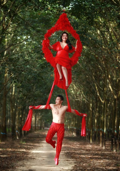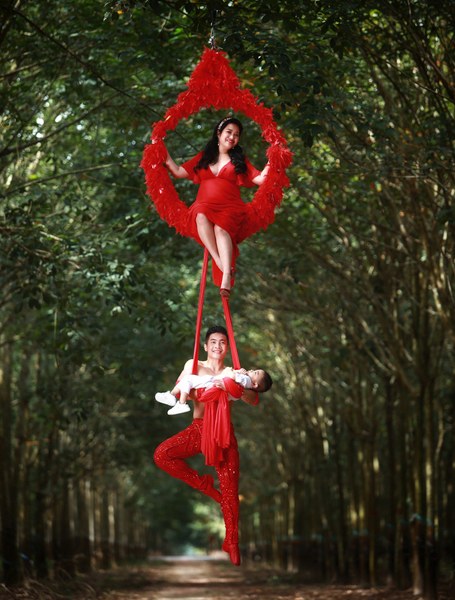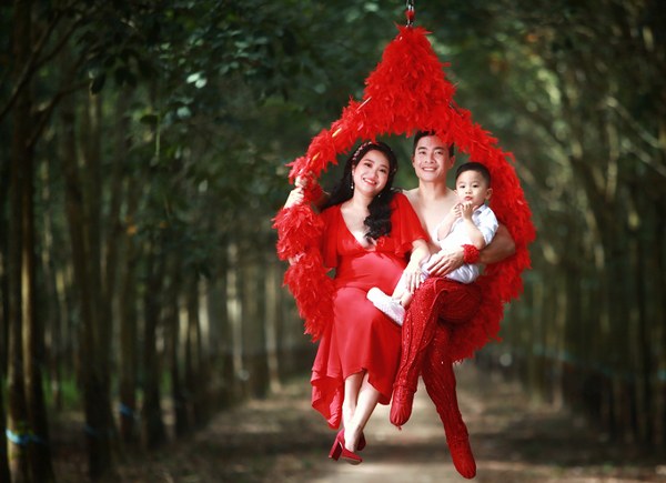Én vàng 2006 Hồng Phượng chụp ảnh diễn xiếc với ông xã Quốc Cơ và con trai khi mang thai bé thứ hai được 7 tháng.