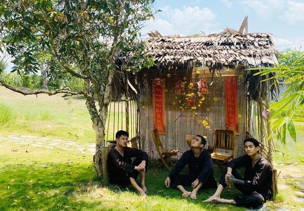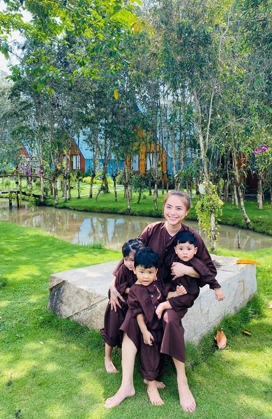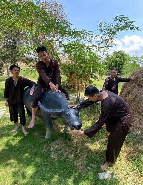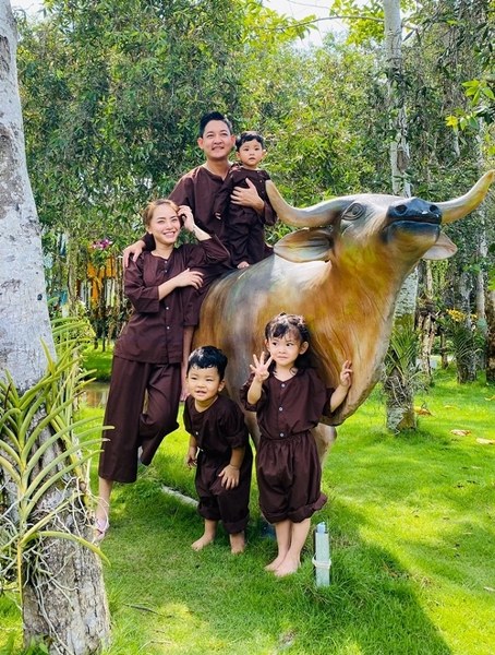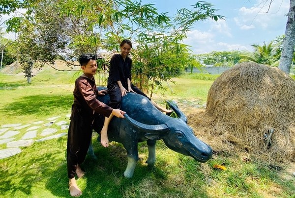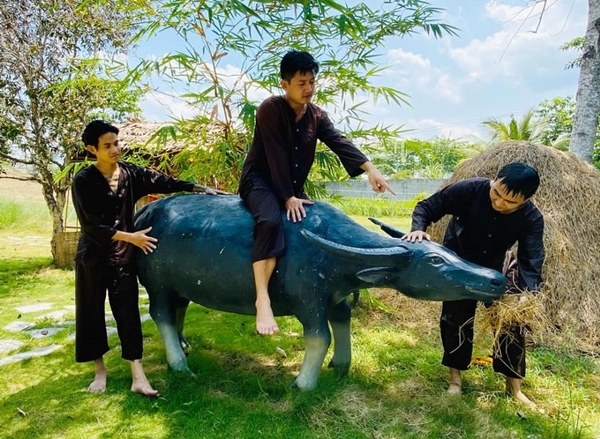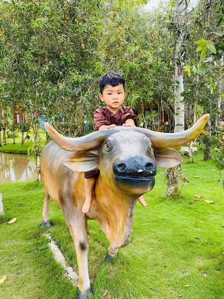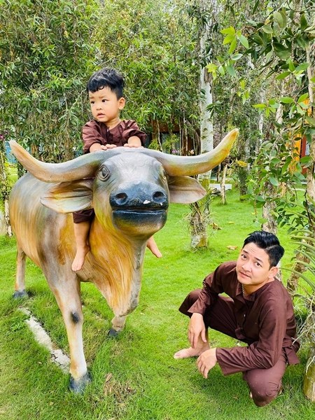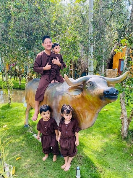 Thành Đạt tạo dáng bên chú trâu đá cùng hai người bạn. Nam diễn viên thấy hài lòng vì sau chuyến đi, các con học được nhiều điều bổ ích về cuộc sống khác xa nơi chúng sinh ra.