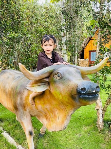 Bé Kem, con gái lớn của Thành Đạt - Hải Băng, rụt rè trong lần đầu cưỡi trâu còn bé Koi khoái chí đạp hai chân ra hiệu cho con vật di chuyển.