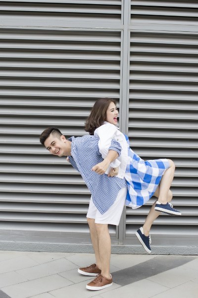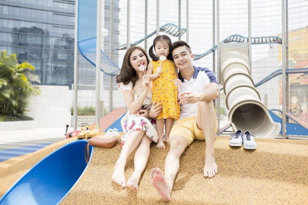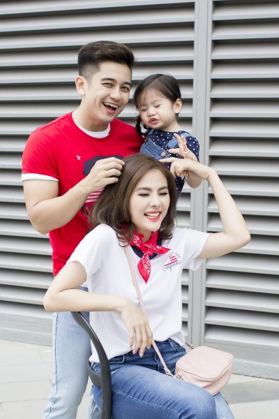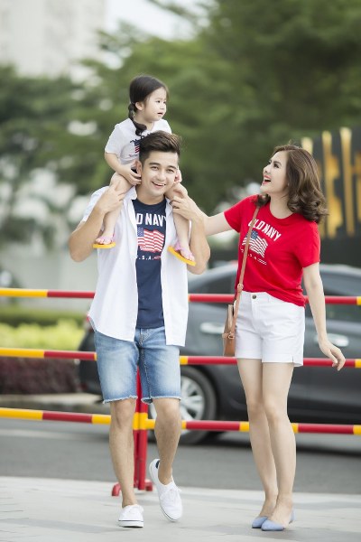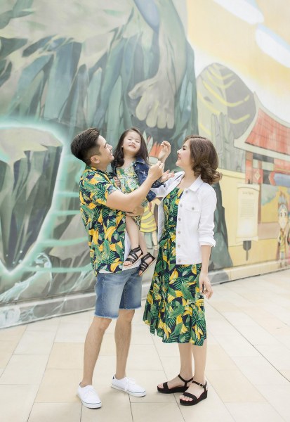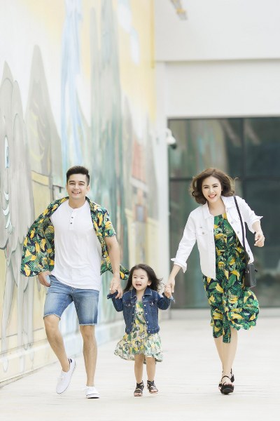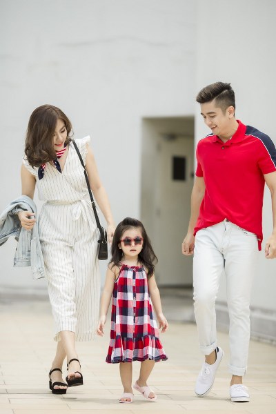 Chiếc váy trắng trên nền hoa dịu dàng của Vân Trang được kết hợp khéo léo cùng màu vàng tươi tắn từ chiếc váy của bé Queenie, tạo nên sự ăn ý trong phong cách của hai mẹ con, giúp cho buổi dạo chơi cuối tuần thêm sinh động. Không để ông xã cảm thấy xa cách, diễn viên đã cũng chọn cho anh một bộ trang phục với kiểu áo polo sáng màu đi cùng quần shorts màu vàng tươi.