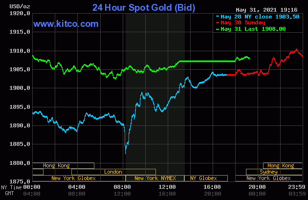 Giá vàng thế giới trên sàn Kitco giao dịch ở mức 1908 – 1909USD/ ounce. Giá vàng trên thị trường quốc tế tiếp tục xu hướng đi lên cho dù áp lực chốt lời khá mạnh. Vàng được kỳ vọng tăng trong dài hạn