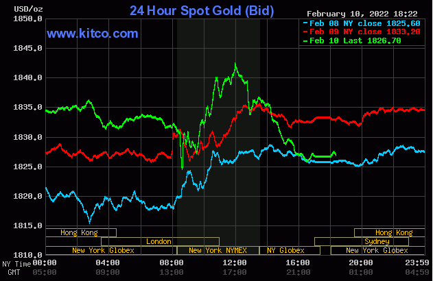 Giá vàng thế giới trên sàn Kitco khép lại phiên giao dịch cuối tuần ở mức 1826.6 – 1827.6 USD/ounce, giảm hơn 6 USD/ounce so với đầu phiên hôm qua. Nhưng giá vàng kỳ hạn tháng 4 tăng 3,5 USD lên 1.840,1 USD/ounce.